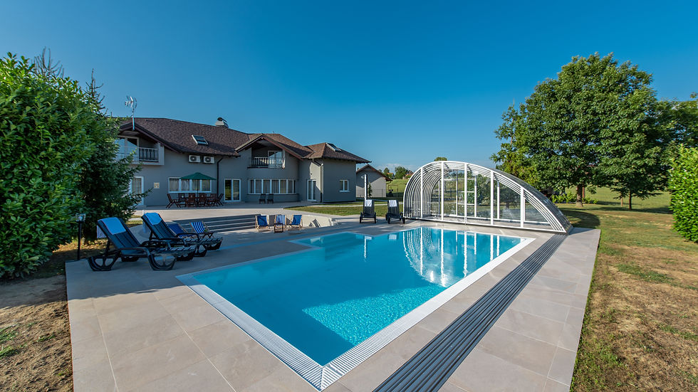 The house also contains a jacuzzi, a Finnish sauna and a large basement room that is excellent for gatherings of family and friends. On sunny days, you can enjoy the outdoor swimming pool with a sun deck and grill, and relax in a large gazebo, while the children can play on the playground.